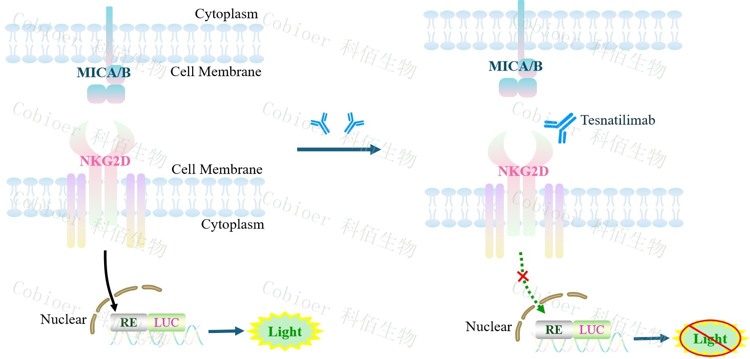 NKG2D Effector Reporter Cell 報(bào)告基因藥靶模型很好的模擬了體內(nèi) NKG2D 的信號(hào)轉(zhuǎn)導(dǎo)過(guò)程,原理見(jiàn)下圖所示。![]() Figure 1. NKG2D Effector Reporter Cell 細(xì)胞模型原理圖 |