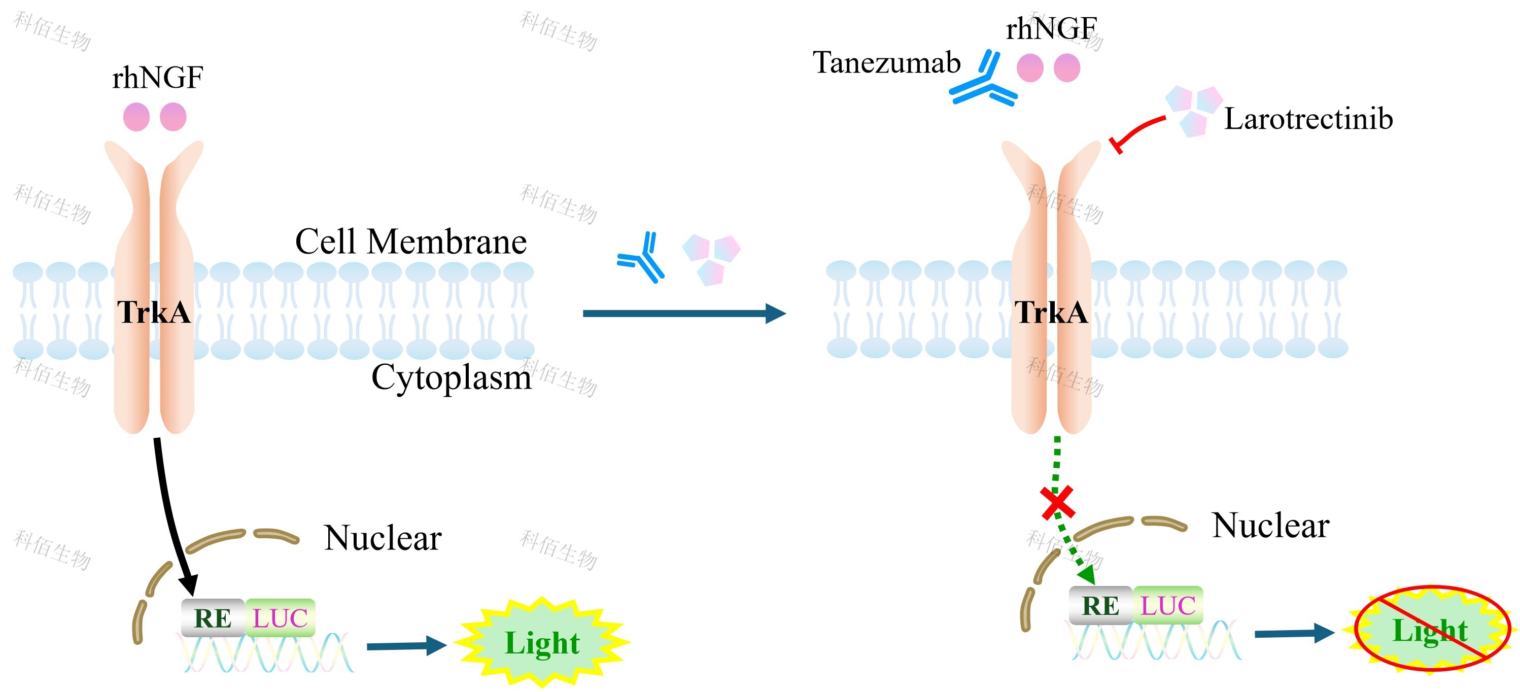 NGF/TRKA Effector Reporter Cell 報告基因藥靶模型很好的模擬了體內(nèi) NGF/TRKA 的 信號轉(zhuǎn)導(dǎo)過程,原理見下圖所示。