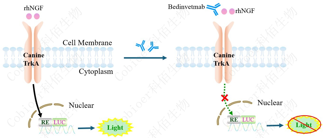 NGF/Canine TRKA Effector Reporter Cell 報(bào)告基因藥靶模型很好的模擬了體內(nèi) NGF/Canine TRKA 的信號轉(zhuǎn)導(dǎo)過程,原理見下圖所示。