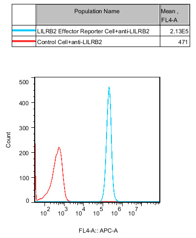 LILRB2 Effector Reporter Cell 報告基因藥靶模型很好的模擬了體內(nèi) LILRB2 的信號轉(zhuǎn) 導(dǎo)過程,原理見下圖所示。![]() ![]() Figure 1. LILRB2 Effector Reporter Cell 模型原理圖 |