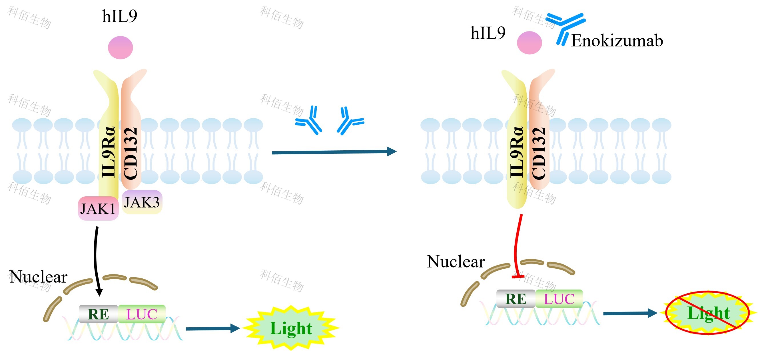 IL9 Effector Reporter Cell 報(bào)告基因藥靶模型很好的模擬了體內(nèi) IL9 的信號(hào)轉(zhuǎn)導(dǎo)過程, 原理見下圖所示。 ![]() Figure 1. IL9 Effector Reporter Cell 模型原理圖 |