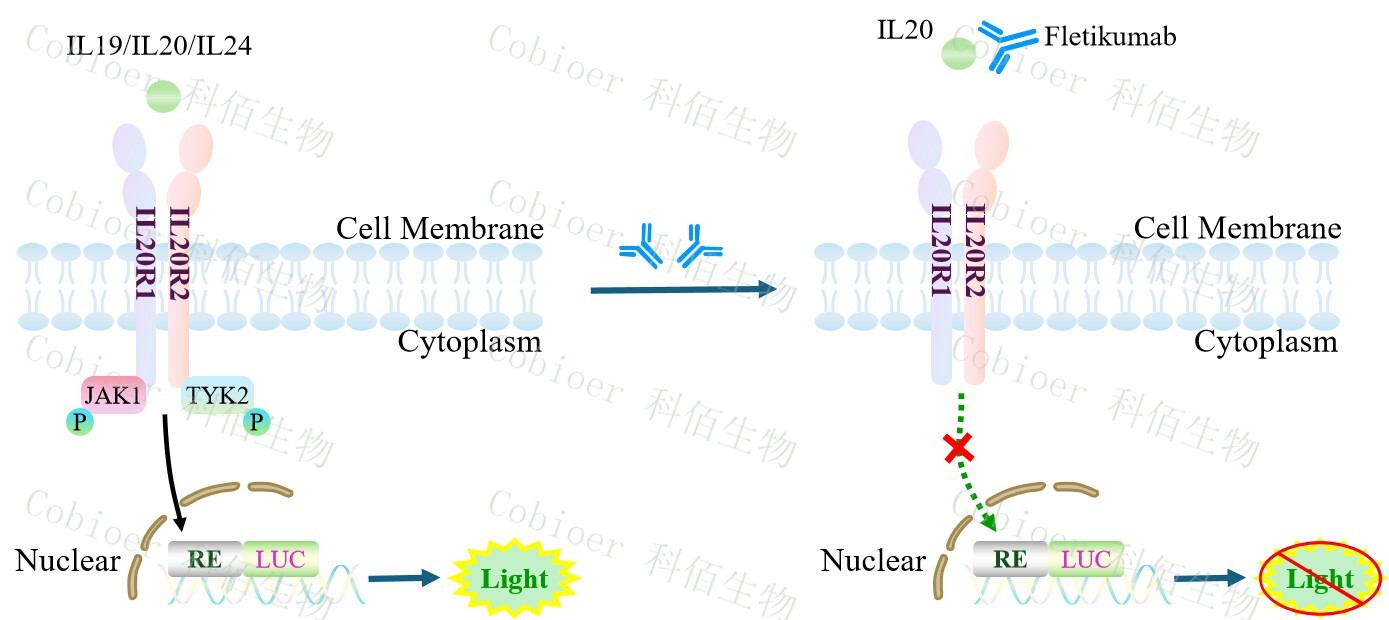 hIL19/IL20/IL24 Triple Effector Reporter Cell 報(bào)告基因藥靶模型很好的模擬了體內(nèi)IL19/IL20/IL24 的信號(hào)轉(zhuǎn)導(dǎo)過程,原理見下圖所示。