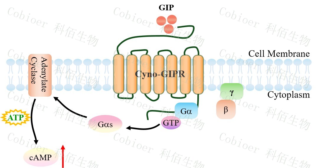cAMP 在 G 蛋白偶聯(lián)受體(GPCR)信號轉(zhuǎn)導(dǎo)中是一種關(guān)鍵的第二信使。當(dāng)配體結(jié)合到 GPCR,構(gòu)象發(fā)生變化,激活受體接著激活G蛋白,Gs的激活導(dǎo)致腺苷酸環(huán)化酶調(diào)控cAMP 的升高。GIPR 藥靶模型很好的模擬了體內(nèi) GIPR 的信號轉(zhuǎn)導(dǎo)過程,原理見下圖所示。