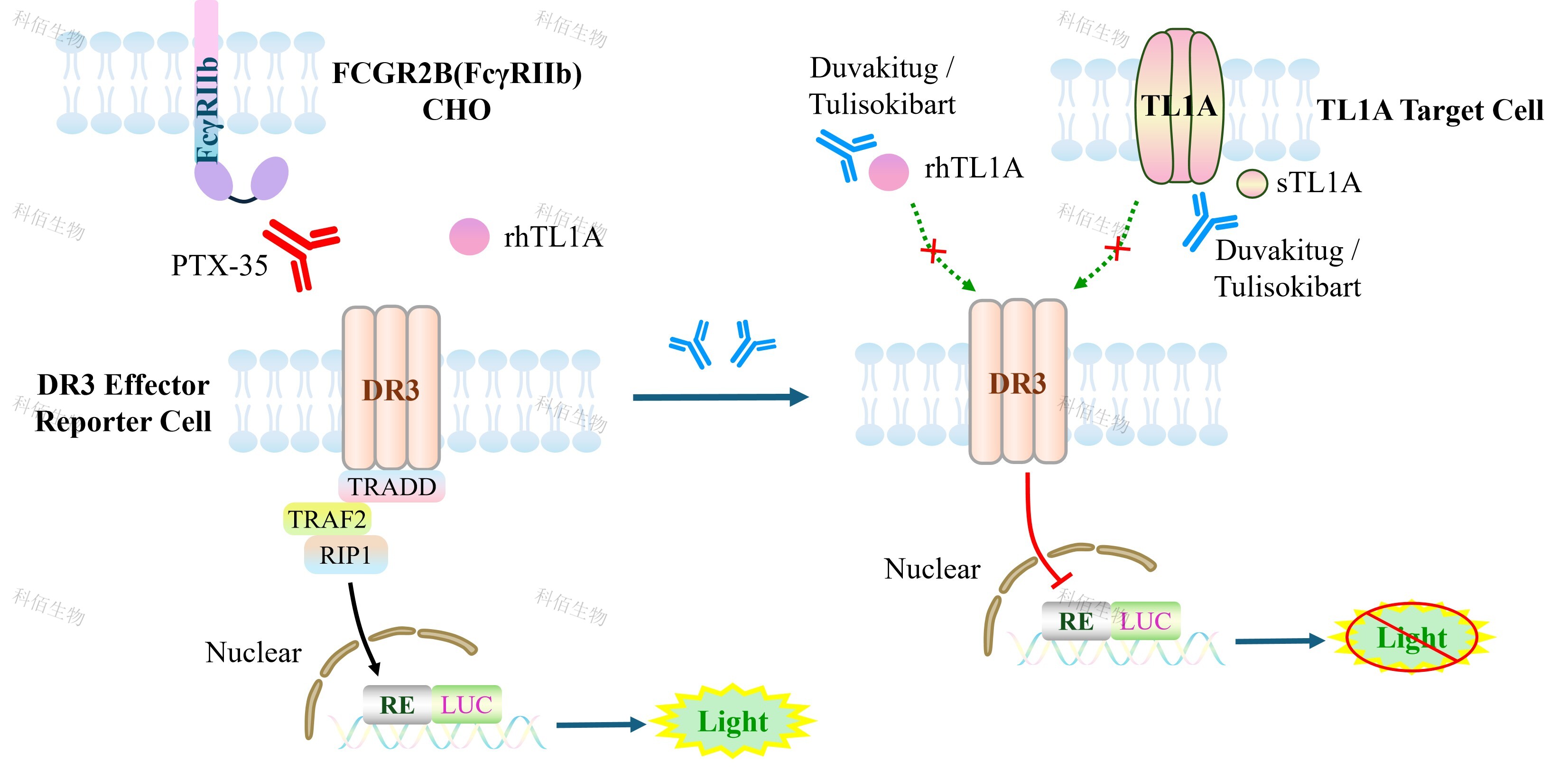 DR3 Effector Reporter 報(bào)告基因藥靶模型很好的模擬了體內(nèi) DR3 的信號(hào)轉(zhuǎn)導(dǎo)過程,原理見下圖所示。![]() |
