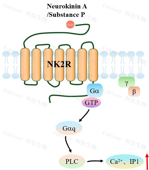 | 速激肽(Tachykinins )是分布在哺乳動(dòng)物中樞和周圍神經(jīng)系統(tǒng)中的一類神經(jīng)肽。速激 肽物質(zhì) P(SP)、神經(jīng)激肽 A(NKA)和神經(jīng)激肽 B(NKB)共享一個(gè)保守的 C 端基序, 對(duì)速激肽受體(NK1R、NK2R 和 NK3R)的激活至關(guān)重要。NKA 優(yōu)先激活與 Gα偶聯(lián)的 NK2R,而 SP 和 NKB 分別優(yōu)先結(jié)合 NK1R 和 NK3R。三種速激肽都能夠在所有速激肽受 體類型中表現(xiàn)為完全激動(dòng)劑。 NK2R 是一種 GPCR,普遍存在于中樞和周圍神經(jīng)系統(tǒng),然而,有研究發(fā)現(xiàn),NK2R 與 血紅蛋白 A1c(HbA1c)水平顯著相關(guān)。HbA1c 是評(píng)估長(zhǎng)期血糖控制的重要指標(biāo),表明 NK2R 可能在糖代謝調(diào)控中發(fā)揮關(guān)鍵作用。 | |