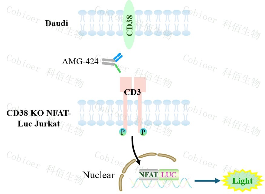 CD38 KO NFAT-Luc Jurkat Cell 報告基因藥靶模型通過報告基因的信號反映 T 細(xì)胞受體 (TCR)信號通路的激活水平,原理見下圖所示。![]() Figure 1. CD38 KO NFAT-Luc Jurkat Cell 細(xì)胞模型圖 |