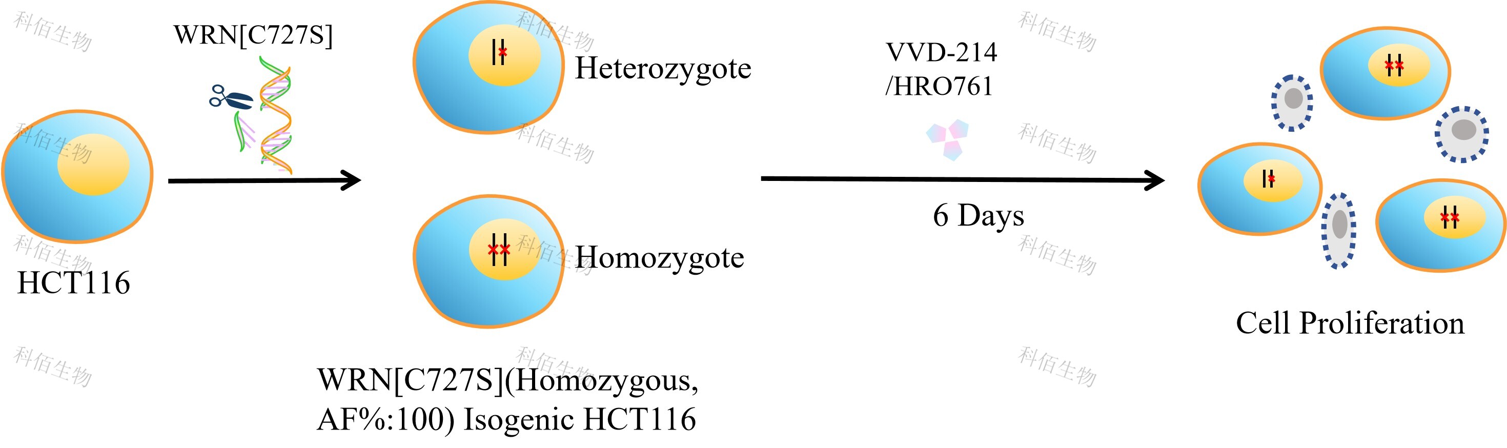WRN[C727S](Homozygous,AF%:100) Isogenic HCT116 藥靶細(xì)胞,通過基因編輯的方式將 WRN 的 727 位氨基酸胱氨酸(C)突變?yōu)榻z氨酸(S)。![]() Figure 1. WRN[C727S](Homozygous,AF%:100) Isogenic HCT116 原理示意圖 |
