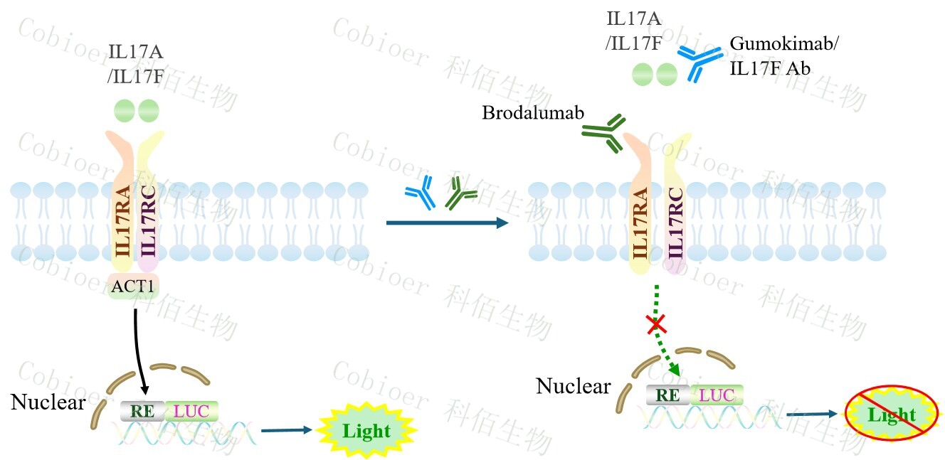 IL17A/17F Effector Reporter Cell 報(bào)告基因藥靶模型很好的模擬了體內(nèi) IL17A/17F 的信號轉(zhuǎn)導(dǎo)過程,原理見下圖所示。![]() Figure 1. IL17A/17F Effector Reporter Cell 細(xì)胞模型原理圖 |