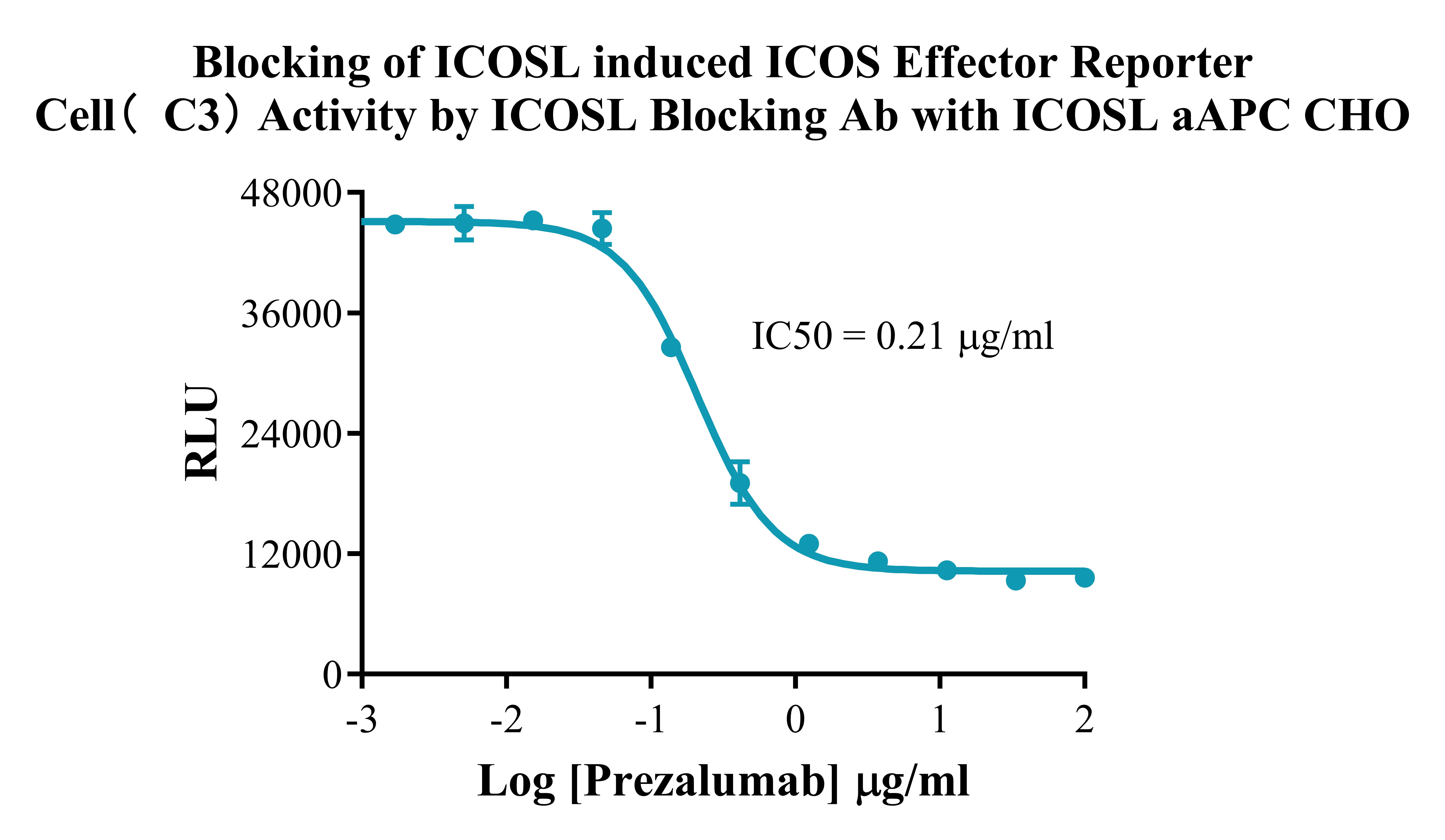 ![]() Figure 2. Recombinant ICOSL aAPC CHO stably expressing ICOSL. ![]() Figure 3. Blocking of ICOSL induced ICOS Effector Reporter Cell(C3) Activity by ICOSL Blocking Ab with ICOSL aAPC CHO. |
