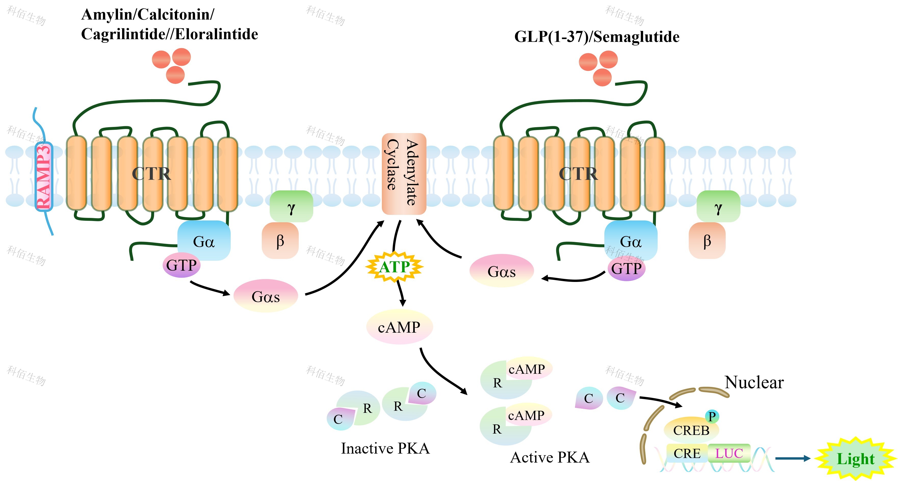 GLP1R&CTR/RAMP3 Dual Reporter Cell 報(bào)告基因藥靶模型很好的模擬了體內(nèi)GLP1R&CTR/RAMP3 的信號(hào)轉(zhuǎn)導(dǎo)過程,原理見下圖所示。
