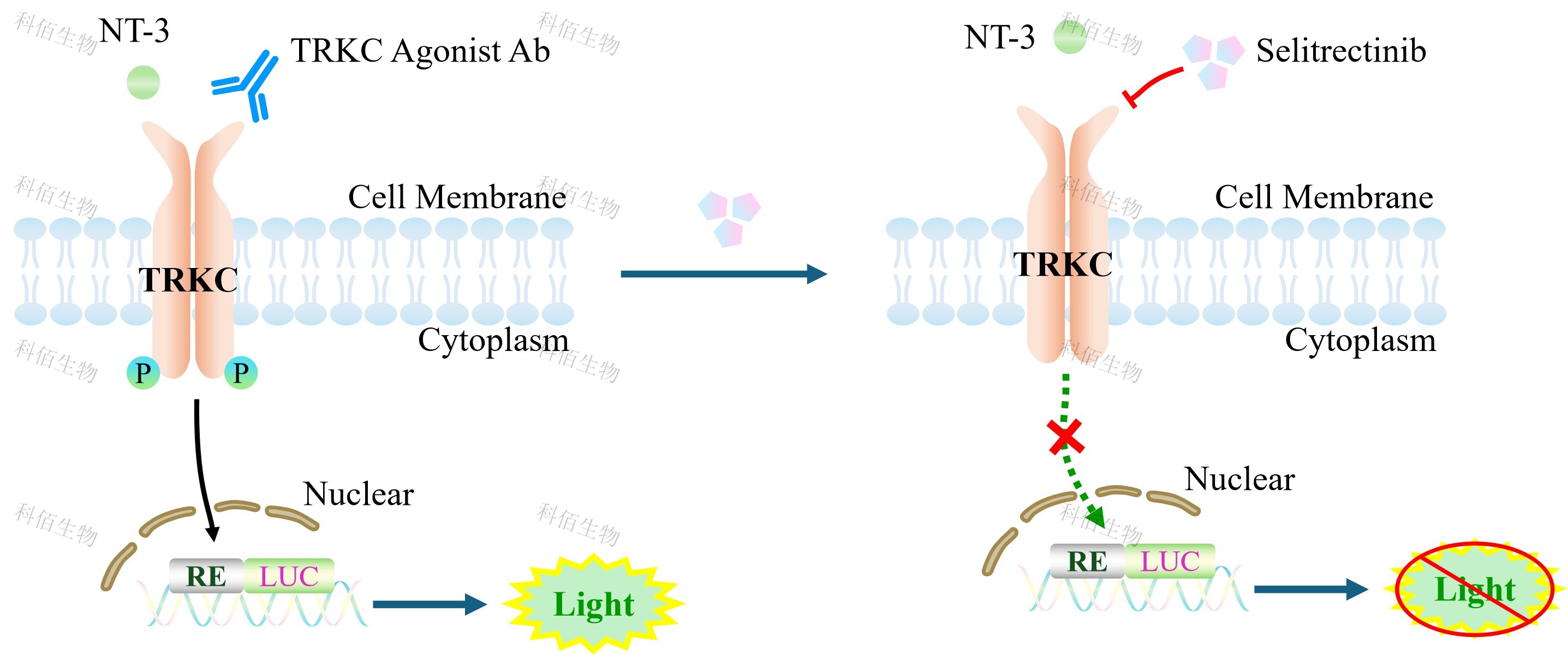TRKC Effector Reporter Cell 報告基因藥靶模型很好的模擬了體內(nèi) TRKC 的信號轉(zhuǎn)導(dǎo)過程,原理見下圖所示。![]() Figure 1. TRKC Effector Reporter Cell 模型原理圖 |