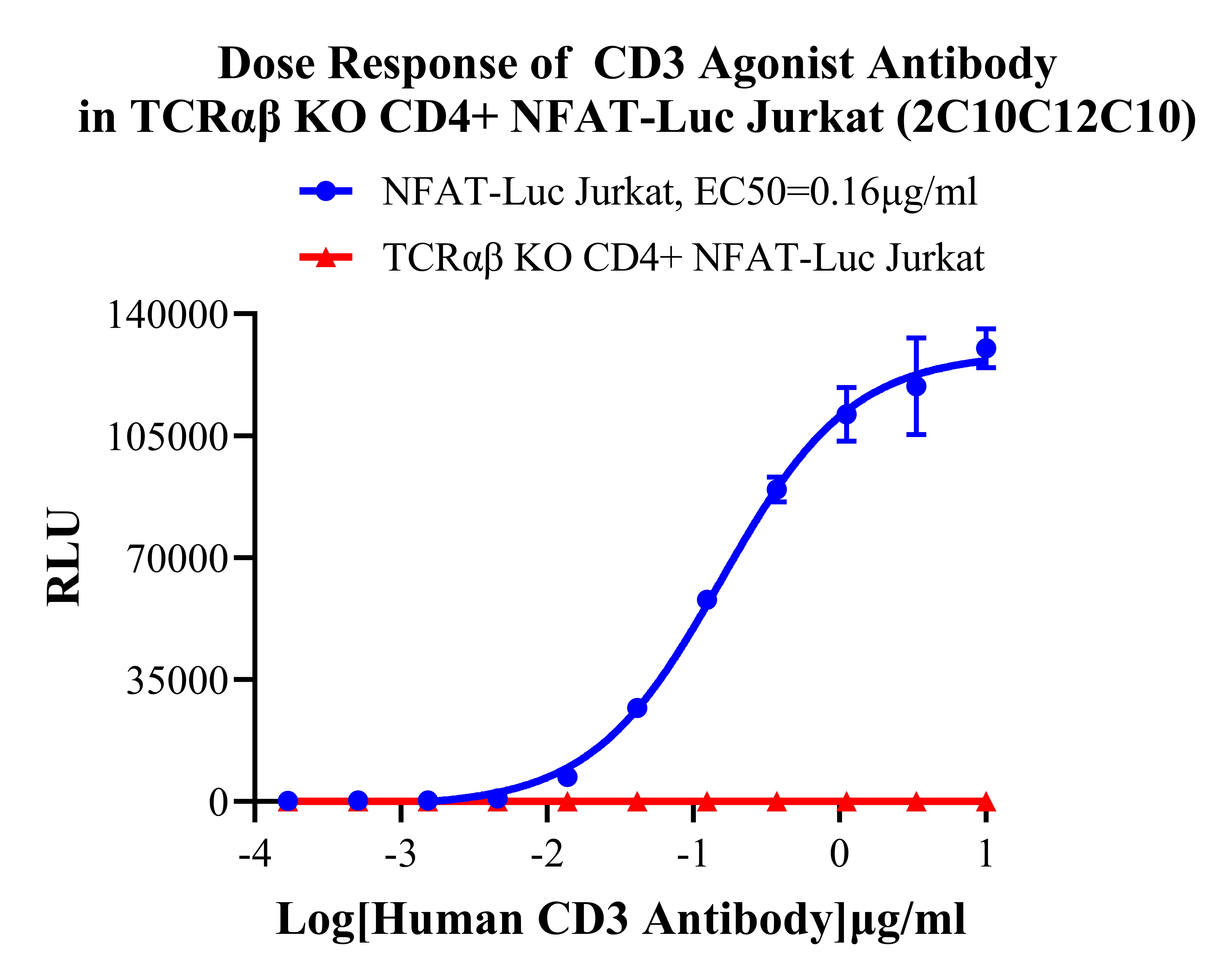 ![]() Figure 2. TCRαβ KO CD4+ NFAT-Luc Jurkat 細胞,在 TCRαβ KO NFAT-Luc Jurkat 細胞上過表達 CD4,見上圖流式驗證 CD4 的過表達效果和 TCRαβ的敲除效果。 ![]() Figure 3. Dose Response of CD3 Agonist Antibody in TCRαβ KO CD4+ NFAT-Luc Jurkat (2C10C12C10).