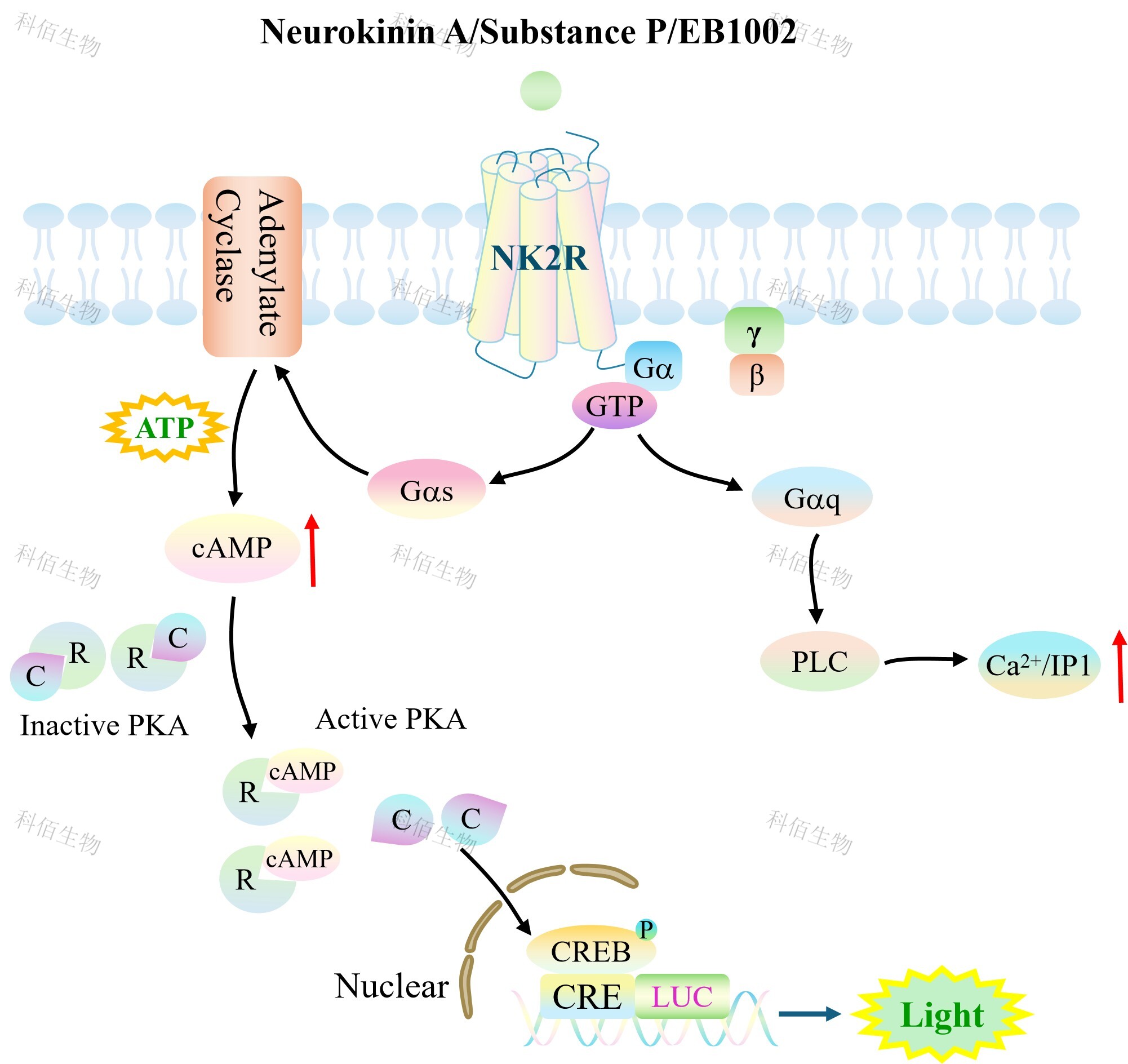 NK2R CRE-Luc HEK293 報(bào)告基因藥靶模型很好的模擬了體內(nèi) NK2R 的信號(hào)轉(zhuǎn)導(dǎo)過(guò)程, 原理見(jiàn)下圖所示。![]() Figure 1. NK2R CRE-Luc HEK293 細(xì)胞模型原理圖 |