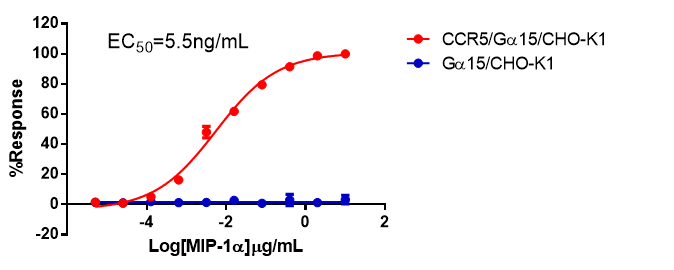 Concentration-dependent stimulation of intracellular calcium mobilization by MIP-1α in CCR5/Gα16/CHO and Gα15/CHO cells Figure 1. MIP-1α-induced concentration-dependent stimulation of intracellular calcium mobilization in CCR5/Gα16/CHO and Gα15/CHO cells. The cells were loaded with Calcium-4 prior to stimulation with an CCR5 receptor agonist, MIP-1α. The intracellular calcium change was measured by FlexStation. |