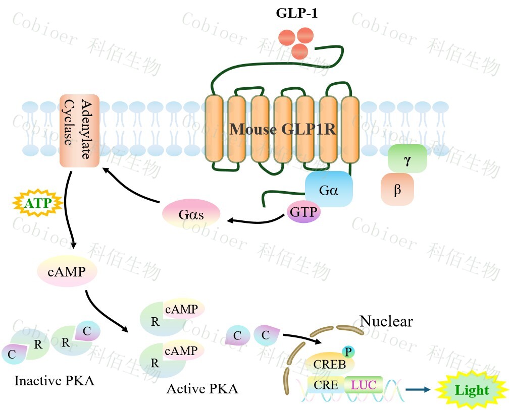 Mouse GLP1R CRE-Luc HEK293 報告基因藥靶模型很好的模擬了體內 GLP1R 的信號轉導過程,原理見下圖所示。![]() Figure 1. Mouse GLP1R CRE-Luc HEK293 細胞模型原理圖 |