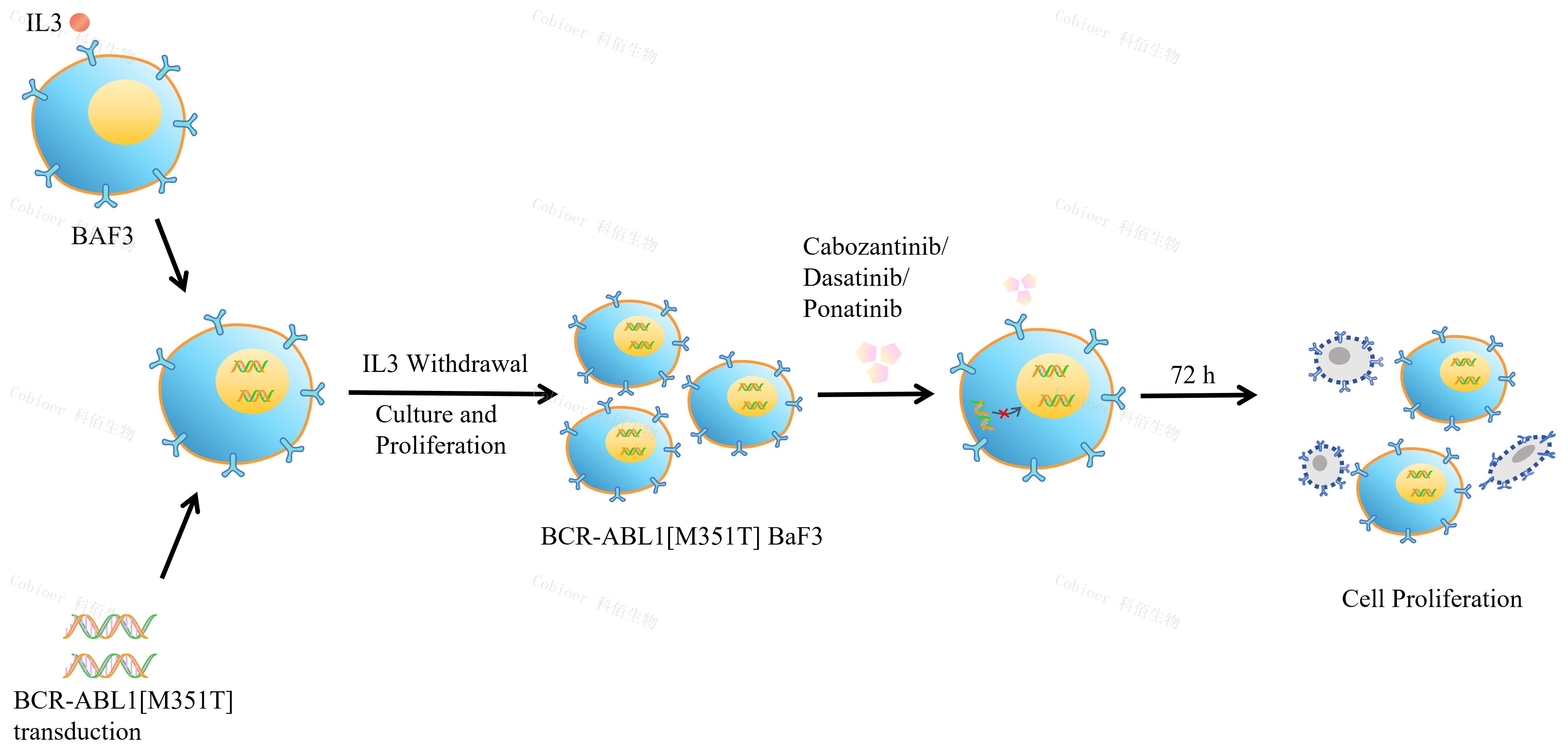 BCR-ABL1[M351T] BaF3 藥靶細(xì)胞, 通過轉(zhuǎn)導(dǎo)突變狀態(tài)的 BCR- ABL1[M351T]基因到 BaF3 細(xì)胞系中,穩(wěn)定表達(dá)人突變形態(tài)下的 BCR-ABL1[M351T]基因。