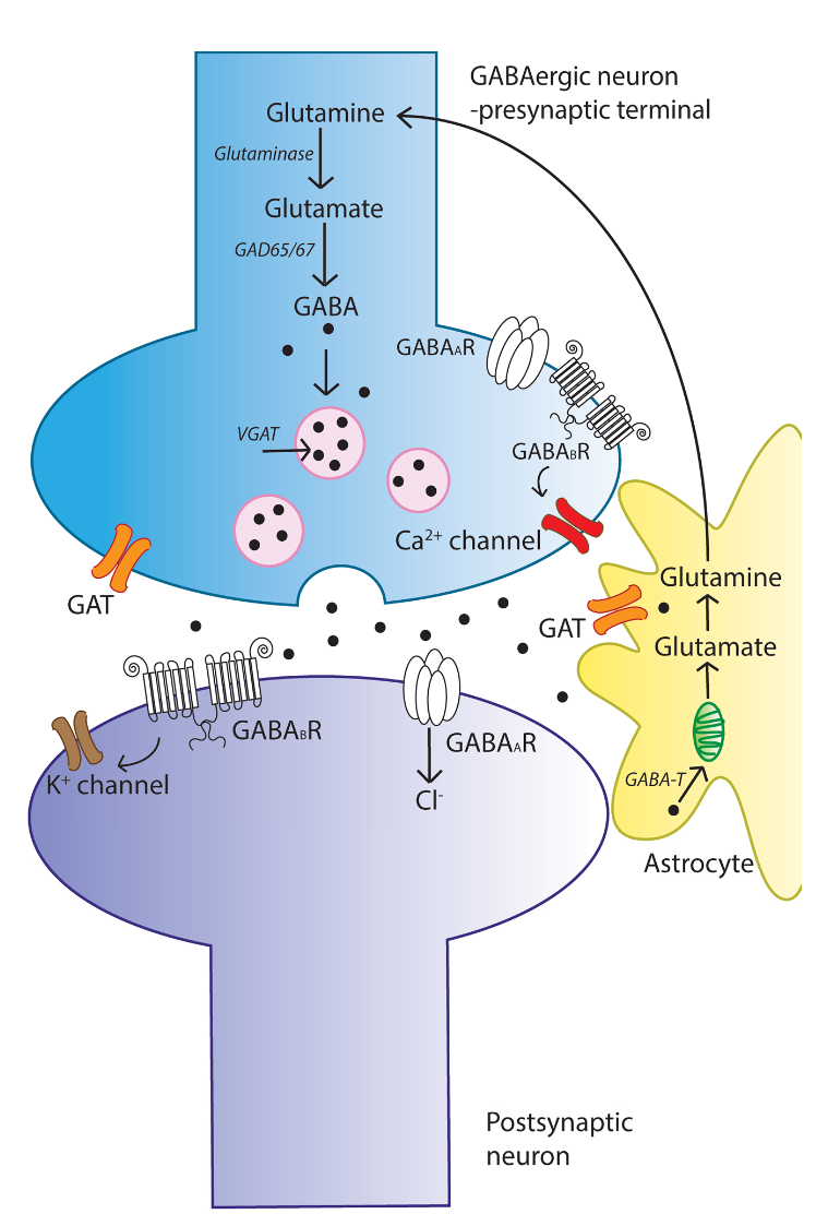 GABA的合成是通過谷氨酸酸脫羧酶(GAD)對L-谷氨酸的α-脫羧作用進行的,并依賴于輔酶吡哆醛-5'-磷酸(維生素B6的一種維生素)。GAD存在兩種主要的亞型:65 kDa亞型(GAD65)和67 kDa亞型(GAD67)。GAD65是哺乳動物大腦中表達的GAD的主要亞型,主要定位于突觸體的軸突末端,容易與質膜相互作用,而GAD67則更廣泛地分布于細胞的細胞質中。兩種GAD亞型的差異分布與細胞內(nèi)兩種GABA的存在相吻合,一種存在于囊泡中,另一種存在于細胞質中,它們通過不同的機制釋放。GABA通過囊泡GABA轉運蛋白(vGAT)的作用被募集到突觸囊泡中。在膜去極化后,GABA被釋放到突觸中,并可與突觸后膜上的嗜離子性GABA受體(GABAAR)或代謝性GABB受體(GABABR)結合,從而抑制突觸后神經(jīng)元。釋放的GABA通過膜結合的GABA轉運體(GATs)從突觸中清除,在星形膠質細胞中,GABA被循環(huán)進入突觸囊泡或被線粒體吸收,在線粒體中被GABA轉氨酶(GABA- t)代謝為谷氨酰胺供神經(jīng)元攝取。