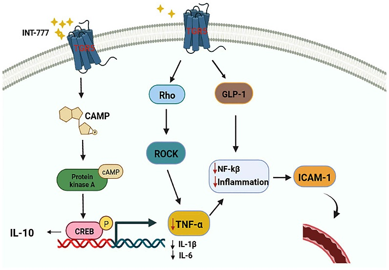 有報(bào)道稱,在慢性炎癥反應(yīng)中,TNF-α可激活多種半胱天冬酶,導(dǎo)致炎癥細(xì)胞凋亡。TGR5已被發(fā)現(xiàn)通過調(diào)節(jié)Rho/Rho相關(guān)蛋白激酶(ROCK)信號(hào)通路來調(diào)節(jié)TNF-α。作為TGR5的激動(dòng)劑,INT-777可以阻斷TNF-α誘導(dǎo)的RMEC增殖和遷移,抑制TNF-α促進(jìn)血管通透性的作用。此外,已有證據(jù)表明,TGR5激動(dòng)劑可以通過激活TGR5- camp蛋白激酶A (PKA)信號(hào)通路,上調(diào)IL-10的表達(dá),發(fā)揮抗炎和免疫抑制作用,降低促炎細(xì)胞因子IL-1β、IL-6和TNF-α的表達(dá)。有研究表明,GLP-1可通過抑制NF-κB延緩ECs的損傷,進(jìn)而抑制IL-1β、IL-6、TNF-α等炎癥因子的分泌。而各種研究證實(shí)GLP-1是TGR5的靶點(diǎn)之一;其分泌依賴于TGR5。因此,推測激活TGR5可能是刺激GLP-1分泌、延緩RMEC損傷的有效途徑。