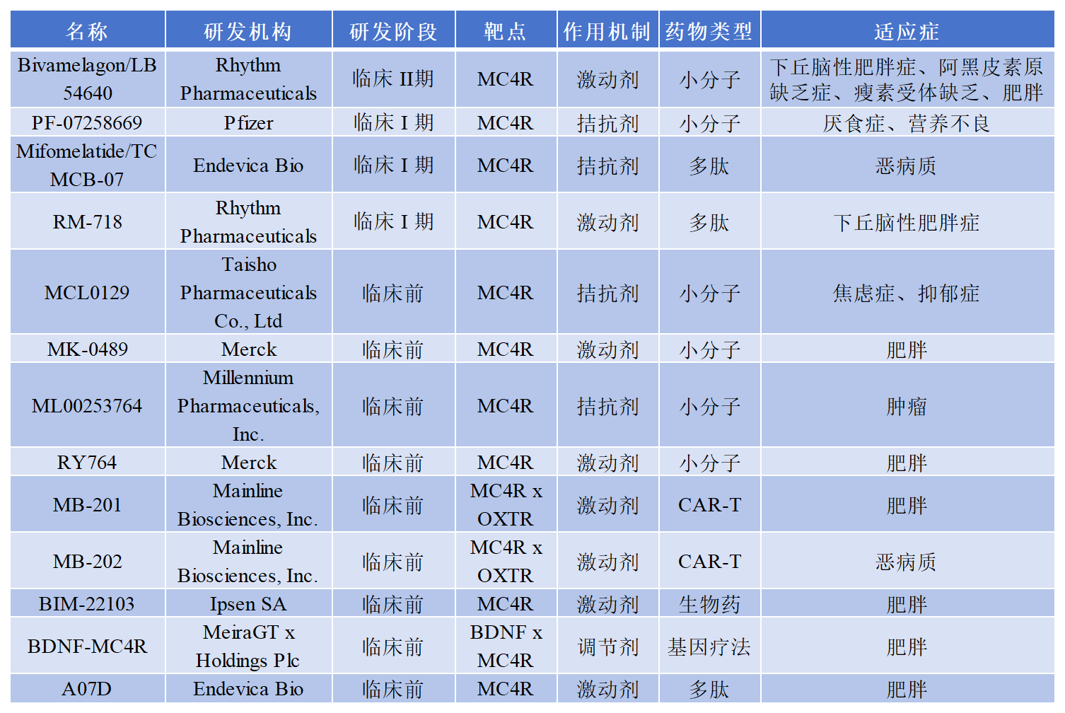 除去臨床階段終止及無進展的幾款藥物,目前共有多款處于臨床及臨床前的靶向MC4R的藥物,既有小分子藥物也有多肽類藥物。部分信息如下:
