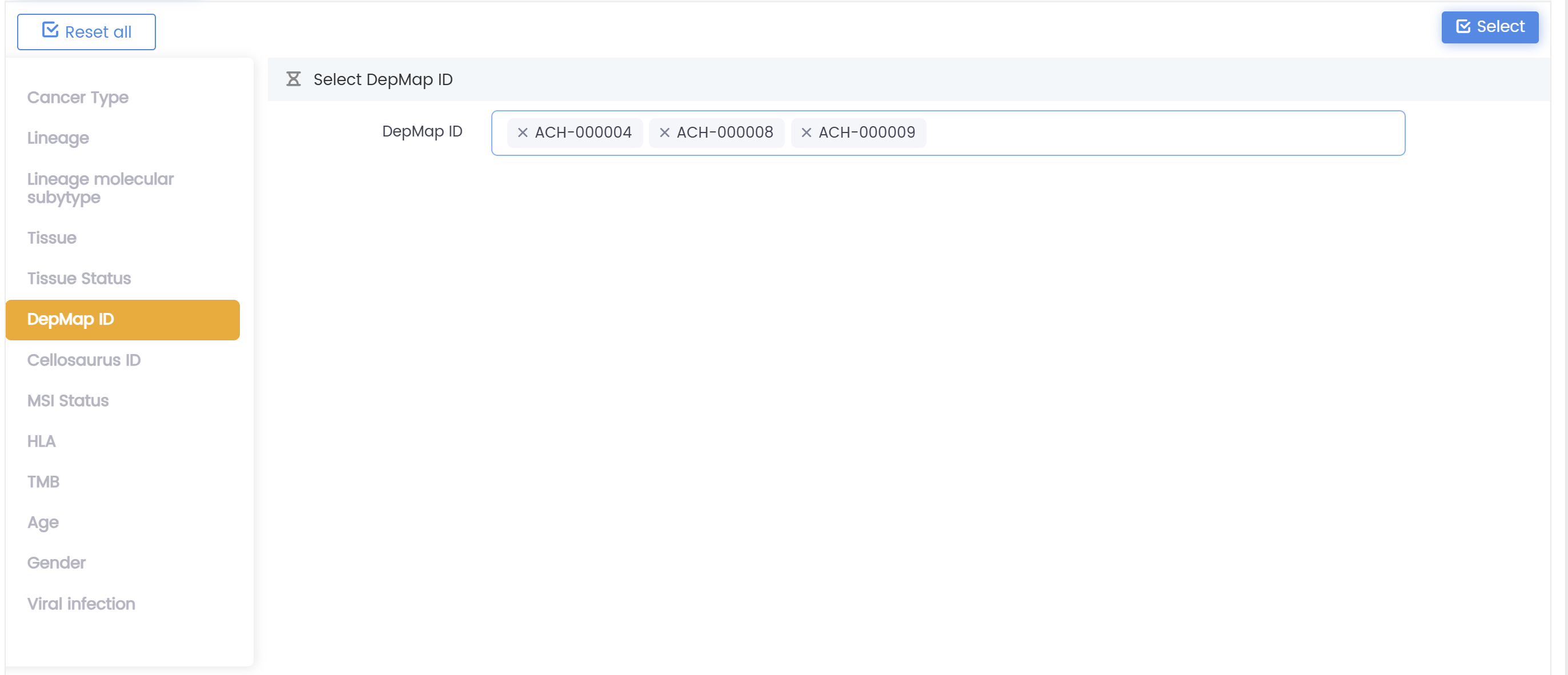 2.根據(jù)癌癥類型、譜系、亞型、組織、性別、年齡、病毒感染及其他相關(guān)因素篩選樣本。點擊右上角的"選擇"按鈕確認(rèn)篩選條件。下圖中包含所有癌癥類型,篩選條件為TMB(突變負(fù)荷)范圍在1.6至51.5突變的病例。