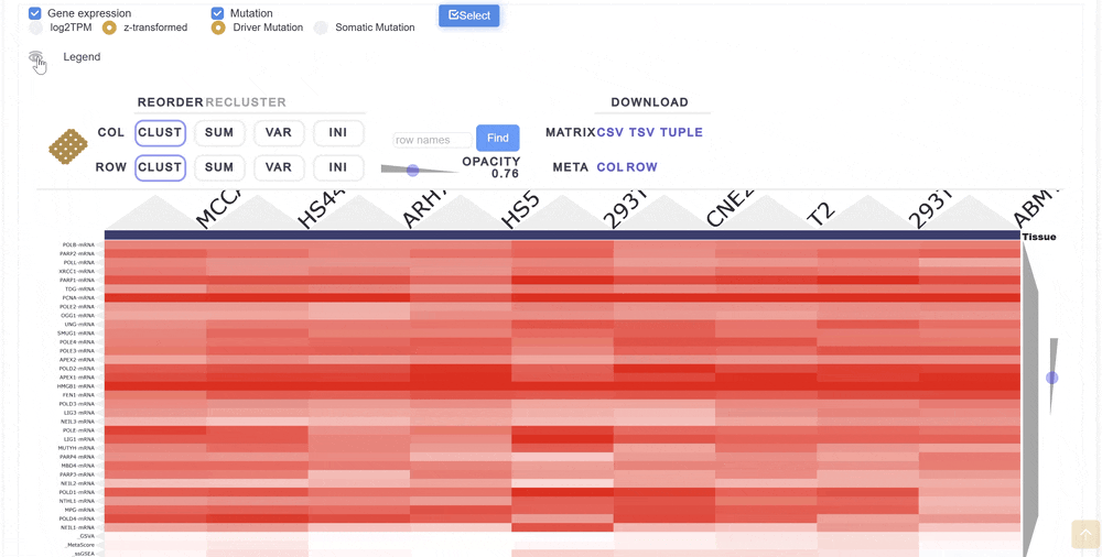 4. 通過交互式熱圖可視化查詢通路內(nèi)所有基因及其突變的表達情況,支持直觀的行列重新排序與聚類功能。展示通路活性、mRNA表達及相關(guān)基因的突變數(shù)據(jù)。支持以多種格式(包括csv、tsv及元組格式)下載底層數(shù)據(jù)。